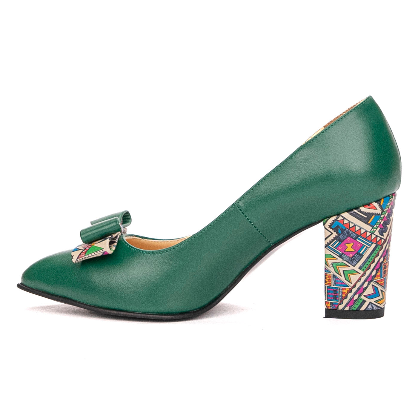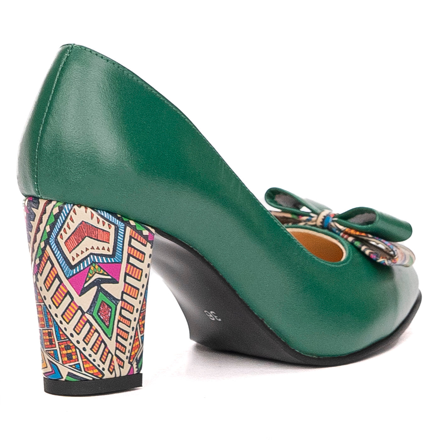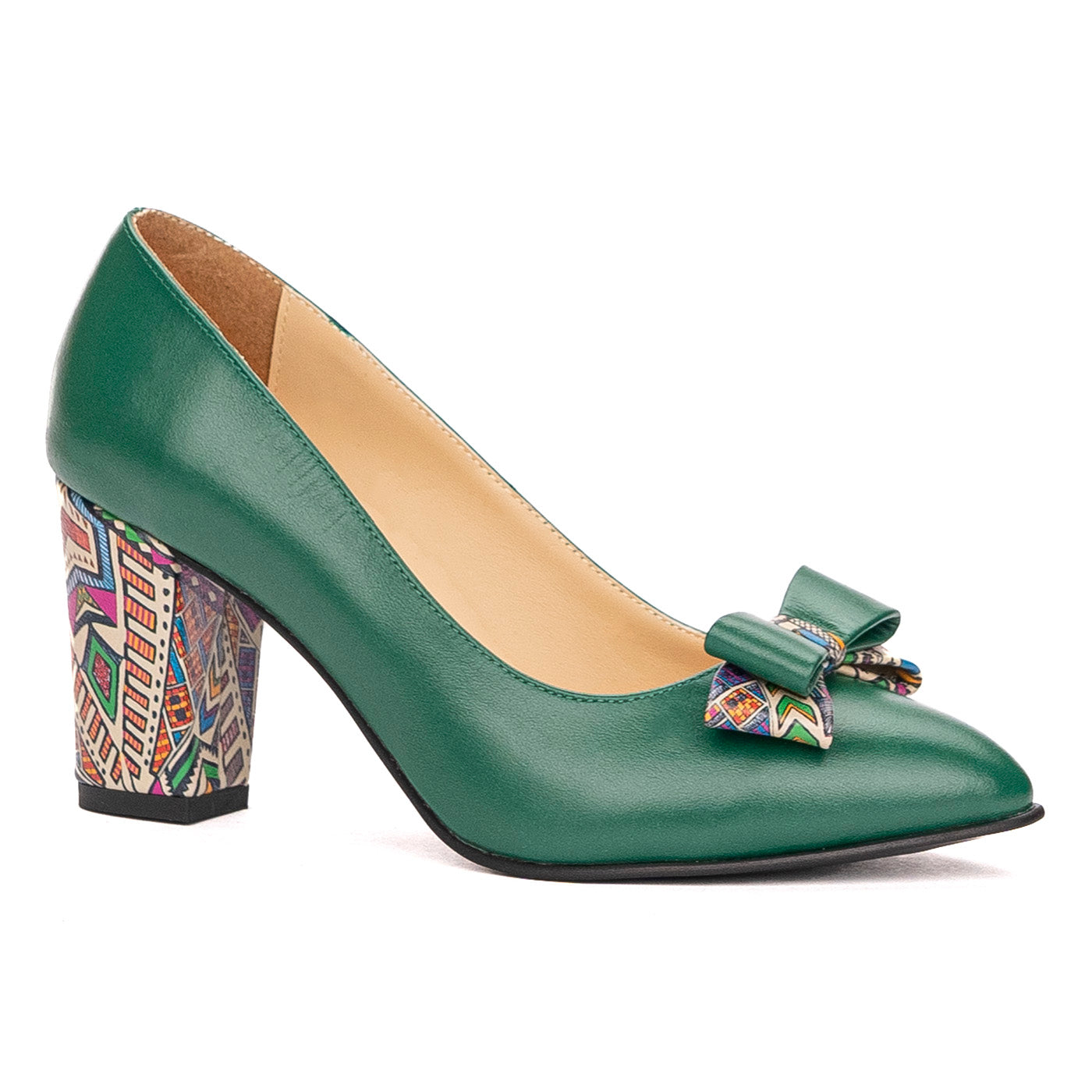 Pantofi dama cu toc gros din piele naturala verde cu fundita